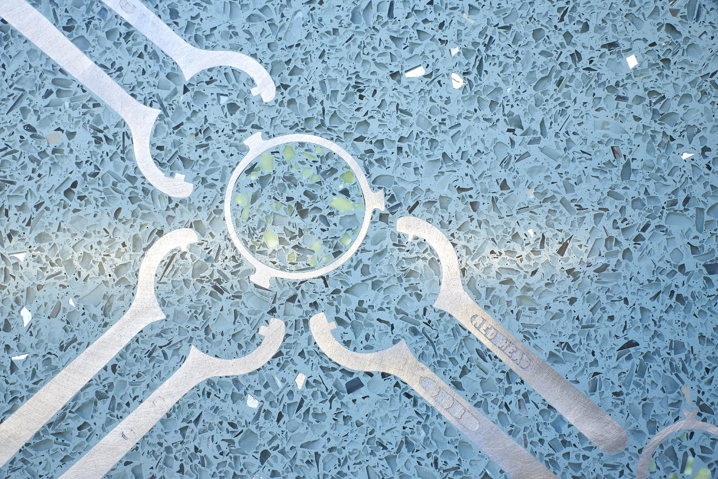 Rug Runner, 2020. Terrazzo, solar-charged luminescent chips, aluminum and decommissioned spanners and couplings. 74 x 3 ft (21.64 x 0.91m). Location: Scottsdale, AZ