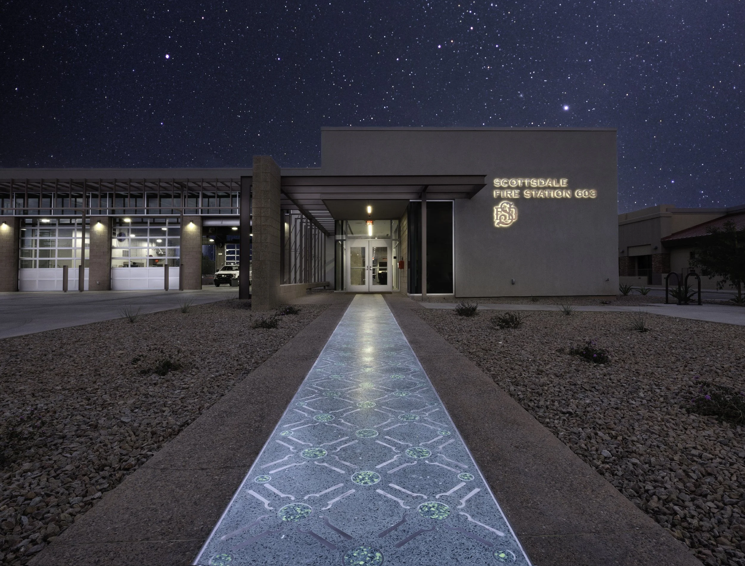 Terrazzo walkway for Scottsdale Fire Station 603 Public Art Project (2018-2020) symbolically placed to connect the outdoor entrance to the interior corridor. The repeating diamond pattern of the interior portion of the walkway, 16 x 3 feet (4.87 x 0.91 m), is embedded with actual spanners and rings sliced from decommissioned firefighting couplings. The exterior portion, 58 x 3 feet (17.67 x 0.91 m), is embedded with the shapes of the same motif cut from aluminum. Solar-charged luminescent chips are embedded into the coupling rings to add illumination. Completed December 2020.