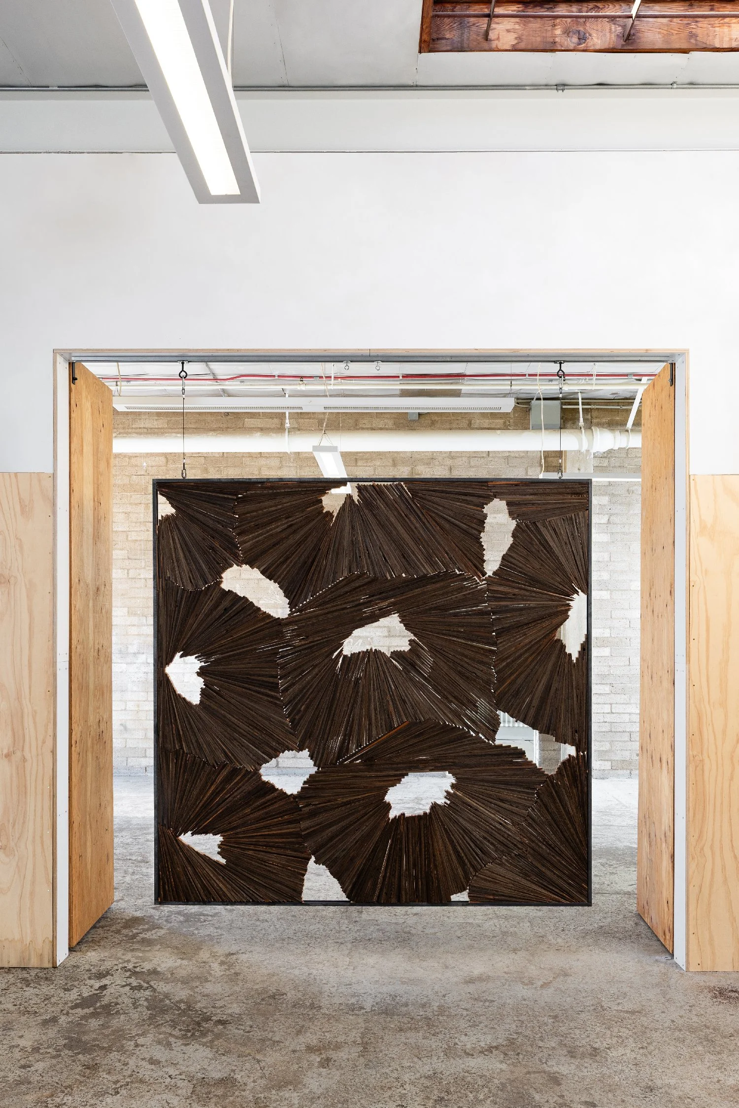 Line Array No 4, 2025. Western Cedar shims, steel, and hardware. 84 x 84 x 1.5 in (213.36 x 213.36 x 3.81 cm)
